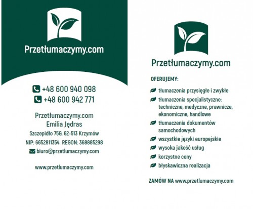 Tłumaczenia przysięgłe i zwykłe wszystkich języków europejskich. Wysoka jakość, krótkie terminy, najlepsze ceny. Zapraszamy do przesyłania dokumentów do bezpłatnej wyceny. Przy stałej współpracy i większych zleceniach możliwa negocjacja cen.